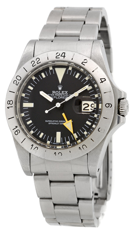 Vintage Gent's Stainless Steel Rolex "Explorer II" # 1655 Original Black Patina Dial with Date Indicator, and Signature Orange 24-Hour Hand, Sweep Second Hand, Acrylic Crystal. Matching Original Stainless Steel Rolex Oyster Bracelet. Model Number: 1655. Case Diameter: 40mm. Circa 1982 - 1983 Production. Handmade Swiss Automatic Movement. Vintage, Original Condition with Rolex Box, Hang Tag, and complete with Capetown's Lifetime Warranty!! Remember, If we're shipping anywhere outside the state of Georgia, you stand to save even more! At this time, as long as we ship out of state, we are not required to collect sales tax at Capetown. Legitimate Tax Savings of up to 10%! Shop and Compare. Capetown Special: $19,990 ON HOLD Capetown is not an official Rolex jeweler. However, we are one of the largest independent vendors of Rolex products in the world since 1969. The Rolex warranty, "if any remains," may be voided, but is replaced by Capetown's Lifetime Warranty Click Here to read about Capetown's quality difference! Click here for the benefits of buying your new or pre-owned Rolex at Capetown. At Capetown, we're always looking for interesting trade- ins toward any purchase, such as your fine watch or upscale jewelry. Please call our purchasing department with any inquiries. Click here for more information. |