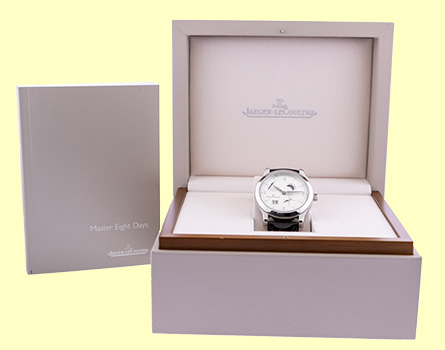 Gent's Stainless Steel Jaeger LeCoultre "Master Control 8 Days" Reserve de Marche Silver Dial with Raised Arabic Numerals & Index Markers, Subsidiary Second Hand, Double Date Indicator. 8-Day Power Reserve Indicator, AM/PM Indicator, Sapphire Crystal. Highest Quality Black Alligator Strap with Stainless Steel Jaeger Dual Deployant Clasp. Reference No: 146.8.17.s Case Measurements: 42mm Handmade Swiss Mechanical Movement Visible Through Sapphire Exhibition Caseback. Like New, Perfect Condition with Large Jaeger LeCoultre Box, Booklet, and complete with Capetown's Lifetime Warranty!! Remember, If we're shipping anywhere outside the state of Georgia, you stand to save even more! At this time, as long as we ship out of state, we do not have to collect Georgia sales tax. Legitimate Tax Savings of up to 10%! Capetown Special: $8,990 SOLD At Capetown, we're always looking for interesting trade- ins toward any purchase, such as your fine watch or upscale jewelry. Please call our purchasing department with any inquiries. Click here for more information. |