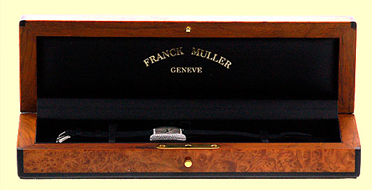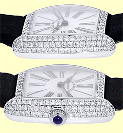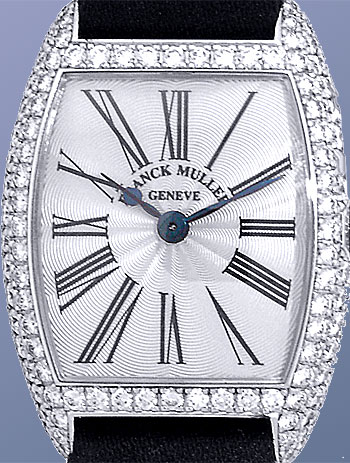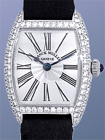 Lady's 18K White Gold Franck Muller Diamond "Cintree Curvex" Dresswatch. Silver Guilloche Dial with Black Roman Numerals, Blue Hands, Sapphire Cabochon on Setting Crown, and Curved Mineral Crystal. Factory Full Pav� 3-Row Diamond Tonneau-Shape Case. Highest Quality Black Franck Muller Satin Strap with 18K White Gold Pav� Diamond Franck Muller Buckle. Reference No: 2251 MC D Case Measurements: 22mm x 23mm ( 29mm with Case Lugs.) Handmade Swiss Mechanical Movement Visible Through Sapphire Exhibition Caseback. A magnificent Lady's wristwatch, hand guilloched dial, Factory installed full Pave Diamond case and even the White Gold Buckle has diamonds on it!! This masterpiece has a hand made Swiss Mechanical Movement, quite rare to find in a Lady's wristwatch as most manufacturers use Quartz movements in Lady's watches. Franck Muller, the most praised watchmaker since Breguet. Showroom Perfect with Franck Muller Wooden Box, and complete with Capetown's Lifetime Warranty!! Remember, If we're shipping anywhere outside the state of Georgia, you stand to save even more! At this time, as long as we ship out of state, we do not have to collect Georgia sales tax. Legitimate Tax Savings of up to 10%! Retail Approx: $24,100 Capetown Special: Please CALL At Capetown, we're always looking for interesting trade-ins toward any purchase, such as your fine watch or upscale jewelry. Please call our purchasing department with any inquiries. Click here for more information. |