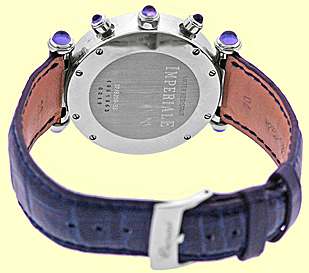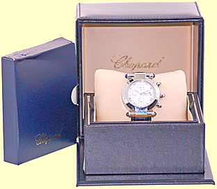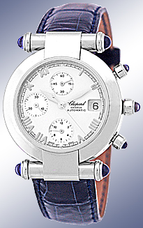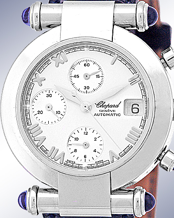 Mid Size/ Gent's Stainless Steel Chopard "Imperiale" Chronograph. White Dial with Silver Guilloche Sub-Dials, Raised Roman Numerals, Subsidiary Second Hand, Chronograph Functions and Date Indicator. Sapphire Cabochon Accents on Pushbuttons and Caselugs. Highest Quality Blue Chopard Alligator Strap with Stainless Steel Chopard Buckle. Reference No: 37/8209-33 Case Diameter: 37mm Case Thickness: 11mm. Handmade Swiss Automatic Movement. Brand New, Unworn Condition with Chopard Box, Warranty Papers, Booklets, and complete with Capetown's Lifetime Warranty!! Remember, If we're shipping anywhere outside the state of Georgia, you stand to save even more! As long as we ship out of state, you don't pay sales tax at Capetown. Legitimate Tax Savings of up to 10%! Retail Approx.: $7,200 You Save Over $2,500!! Capetown Special: $4,790 At Capetown, we're always looking for interesting trade-ins toward any purchase, such as your fine watch or upscale jewelry. Please call our purchasing department with any inquiries. Click here for more information. |