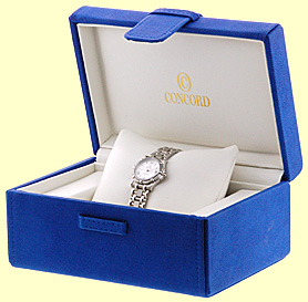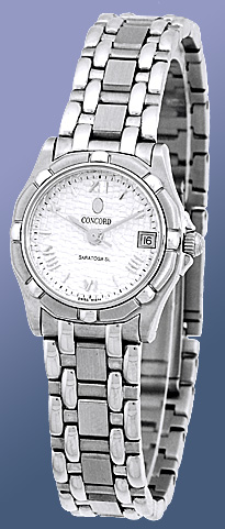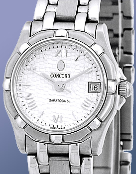 Lady's Small Stainless Steel Concord "Saratoga SL" Silver Mosaic Dial with Raised Roman Numerals and Baton Hour Markers, Date Indicator, and Sapphire Crystal. Matching Stainless Steel Concord Bracelet. Case Diameter: 23mm Quartz Accuracy Movement. An every day watch for the housewife on the go, the working woman who wants some style with her utility at a reasonable price. The Concord Saratoga retails for $1,450. Brand New, Factory Fresh with Concord Box, Booklets, Papers, and Complete with Capetown's Lifetime Warranty!! Remember, If we're shipping anywhere outside the state of Georgia, you stand to save even more! As long as we ship out of state, you don't pay sales tax at Capetown. Legitimate Tax Savings of up to 10%! Retail Approx.: $1,450 You Pay Less Than Half!!! Capetown Special: $690 |