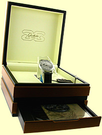 Gent's Stainless Steel Glashütte "Senator" Date/Moonphase Strapwatch. Silver Dial with Raised Silver Batons, Sweep Second Hand and Large Date Indicator. Moon Phase Indicator, Stainless Steel Bezel. Highest Quality Glashütte Black Crocodile Strap with Glashütte Deployant Clasp. Reference No: 39-41-04-12-04 Power Reserve: 40 Hours Water Resistant to 5 Atmospheres Case Diameter: 40mm. Handmade Automatic Movement Visible Through Exhibition Caseback. Made in Germany with the utmost precision, Glashütte is giving A. Lange & Söhne a run for the money!! Brand New, Showroom Perfect with Glashütte Box, Warranty Papers, Booklet, CD, Tags and complete with Capetown's Lifetime Warranty!! Remember, If we're shipping anywhere outside the state of Georgia, you stand to save even more! As long as we ship out of state, you don't pay sales tax at Capetown. Legitimate Tax Savings of up to 10%! Retail Approx.: $10,700 You Save Over $3,200!! Capetown Special: $7,490 At Capetown, we're always looking for interesting trade-ins toward any purchase, such as your fine watch or upscale jewelry. Please call our purchasing department with any inquiries. |