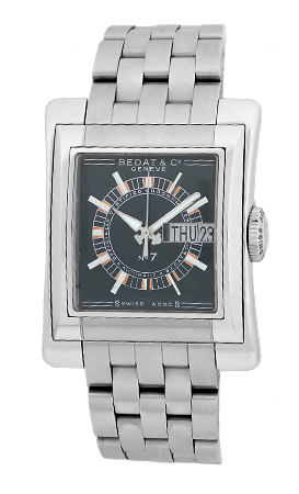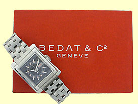 Gent's Stainless Steel Bedat & Co. No. 7 Automatic. Black & Red Accent Roulette Dial with Raised Silver Baton Hour Markers, Day & Date Indicators, and Sapphire Crystal. Matching Stainless Steel Bedat & Co. No. 7 Bracelet. Reference No: B797.011.328 Case Measurements: 38mm X 47mm Case Thickness: 12.5mm Handmade Swiss Automatic Movement. Bedat, pronounced "Be-dah". Over the past few years, Neiman Marcus has stirred up a tremendous amount of interest in this small watch company�s offerings. It�s unique styling can be seen on the best wrists around the World. This massive Bedat No. 7 , besides telling the time, the watch also gives you the date, its automatic, sweep second hand, and its massiveness elegantly concealed because the case is curved to more gracefully accommodate most wrists. Brand-New, Showroom Perfect with Bedat Box, Booklets, Warranty Papers, and complete with Capetown's Lifetime Warranty!! Remember, If we're shipping anywhere outside the state of Georgia, you stand to save even more! As long as we ship out of state, you don't pay sales tax at Capetown. Legitimate Tax Savings of up to 10%! Retail Approx.: $5,000 You Save Over $2,800!! Capetown Special: $2,190 At Capetown, we're always looking for interesting trade-ins toward any purchase, such as your fine watch or upscale jewelry. Please call our purchasing department with any inquiries. |