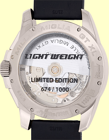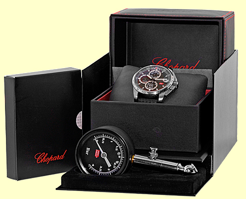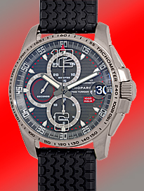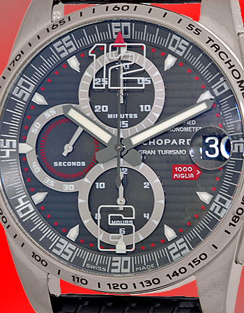 Gent's Titanium Chopard "Mille Miglia GT XL" Chronograph Strapwatch. Charcoal Gray Guilloche Dial with Luminescent Hour Markers, Silver Arabic Numerals, Subsidiary Second Hand, Date Indicator, Chronographp Functions and Sapphire Crystal. Highest Quality Black Synthetic Rubber Tire Strap with Titanium Chopard Buckle. Reference No: 16/8459-3005 Case Diameter: 44mm Handmade Automatic Movement Visible Through Sapphire Exhibition Caseback. Brand New, Showroom Fresh with Chopard Box, Booklets, Warranty Papers, Tire Gauge and complete with Capetown's Lifetime Warranty!! Remember, If we're shipping anywhere outside the state of Georgia, you stand to save even more! As long as we ship out of state, you don't pay sales tax at Capetown. Legitimate Tax Savings of up to 10%! Retail Approx.: $9,570 You Save Over $4,000!! Capetown Special: $5,490 Special Order Item At Capetown, we're always looking for interesting trade-ins toward any purchase, such as your fine watch or upscale jewelry. Please call our purchasing department with any inquiries. Click here for more information. |