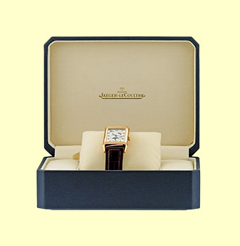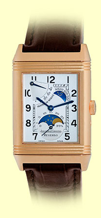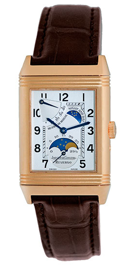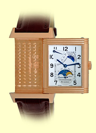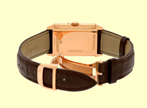 Gent's 18K Rose Gold Jaeger LeCoultre Reverso "Sun Moon". Front: Silvered Guilloch� Dial with Blued-steel Hands, Black Arabic Numerals, Subsidiary Second Hand, Moon/Sun Indicator, Power Reserve Indicator, Sapphire Crystal.Reverse: Sapphire Exhibition Display Caseback.Highest Quality Brown Jaeger-LeCoultre Alligator Strap with 18K Rose Gold Jaeger-LeCoultre Deployant Clasp. Reference No: 270.2.63 / Q2752420 Case Measurements: 26mm X 36.5mm (42mm with case Lugs) Case Thickness: 12mm Water Resistance: 30m / 100ft Power Reserve: 45hr Handmade Swiss Mechanical(manual-winding) Movement Visible Through Sapphire Exhibition Caseback (Calibre 823) Like New, PERFECT Condition with Jaeger-LeCoultre Box and complete with Capetown's Lifetime Warranty!! Remember, If we're shipping anywhere outside the state of Georgia, you stand to save even more! As long as we ship out of state, you don't pay sales tax at Capetown. Legitimate Tax Savings of up to 10%! Capetown Special: $13,990 SOLD At Capetown, we're always looking for interesting trade- ins toward any purchase, such as your fine watch or upscale jewelry. Please call our purchasing department with any inquiries. Click here for more information. |