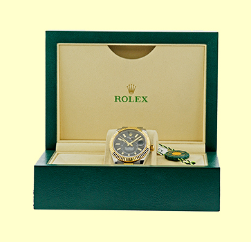 Capetown Certified Pre-Owned Gent's Stainless Steel & 18K Yellow Gold 42mm Rolex "Sky-Dweller". Black Dial with Yellow Gold Luminescent Hands and Index Hour Markers, Center Sweep Seconds Hand. Off-center 24-Hour Display Disk with Fixed Inverted Red Triangle on the Dial for Second Time Zone, Month Display (12-apertures around the dial), Annual Calendar. 18K Yellow Gold Fluted Bidirectional Rotatable Rolex Ring Command Bezel, Date Indicator, Sapphire Crystal Stainless Steel & 18K Yellow Gold Rolex "Oyster" Bracelet with Folding Oysterclasp and Easylink Extension Link. Model Number: 326933 Case Diameter: 42mm Case Thickness: 14mm Water Resistance: 100m / 330ft Power Reserve: 72hr Random Serial Number, Inner Bezel Engraved Handmade Swiss COSC(Swiss Official Chronometer Testing Institute) Certified Automatic Movement(Calibre 9001 ) Like New, Perfect Condition with Rolex Box, Booklet, Hang Tag and complete with Capetown's Lifetime Warranty!! Remember, If we're shipping anywhere outside the state of Georgia, you stand to save even more! At this time, as long as we ship out of state, we are not required to collect sales tax at Capetown. Legitimate Tax Savings of up to 10%! Capetown Special: $18,890 Capetown is not an official Rolex jeweler. However, we are one of the largest independent vendors of Rolex products in the world since 1969. The Rolex warranty, "if any remains," may be voided, but is replaced by Capetown's Lifetime Warranty Click Here to read about Capetown's quality difference! Click here for the benefits of buying your new or pre-owned Rolex at Capetown. At Capetown, we're always looking for interesting trade- ins toward any purchase, such as your fine watch or upscale jewelry. Please call our purchasing department with any inquiries. Click here for more information. |