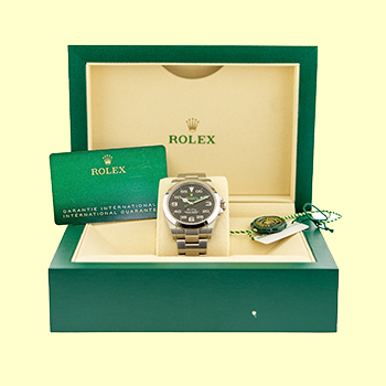 Gent's Stainless Steel 40mm Rolex Oyster Perpetual "Air-King". Black Dial with White Gold Luminescent Hands and Arabic Numerals at 3,6 and 9, Printed White Minutes Numbers, Green Center Sweep Seconds Hand. Stainless Steel Smooth Bezel, Green Color Lettering "Rolex" on the Dial, Sapphire Crystal. Matching Stainless Steel Rolex "Oyster" Bracelet with Folding Oysterclasp and Easylink Comfort Extension Link. Model Number: 126900 Case Diameter: 40mm Case Thickness: 13mm Water Resistance: 100m / 330ft Power Reserve: 70hr Random Serial Number, Inner Bezel Engraved, Rolex Warranty Card Dated 2025 Handmade Swiss Chronometer Certified(COSC) Automatic Movement(Caliber 3230). Brand New UNWORN Condition with Rolex Box, Booklet, Rolex Warranty Card Dated 2025, Hang Tag and complete with Capetown's Lifetime Warranty!! Remember, If we're shipping anywhere outside the state of Georgia, you stand to save even more! At this time, as long as we ship out of state, we are not required to collect sales tax at Capetown. Legitimate Tax Savings of up to 10%! Capetown Special: $8,990 Capetown is not an official Rolex jeweler. However, we are one of the largest independent vendors of Rolex products in the world since 1969. The Rolex warranty, "if any remains," may be voided, but is replaced by Capetown's Lifetime Warranty Click Here to read about Capetown's quality difference! Click here for the benefits of buying your new or pre-owned Rolex at Capetown. At Capetown, we're always looking for interesting trade- ins toward any purchase, such as your fine watch or upscale jewelry. Please call our purchasing department with any inquiries. Click here for more information. |